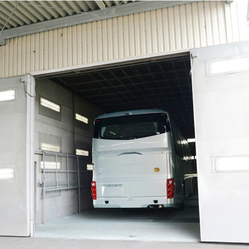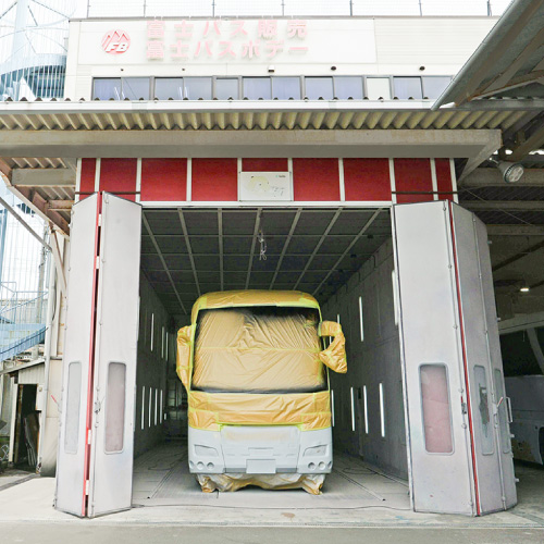 走る広告塔としてのバスのデザイン塗装は、当社でも特に力を入れているセクションです。絶対の自信を誇る塗装のツヤは、まるで新車の輝き。3機のブースをフル稼働し、品質とスピードを両立させています。